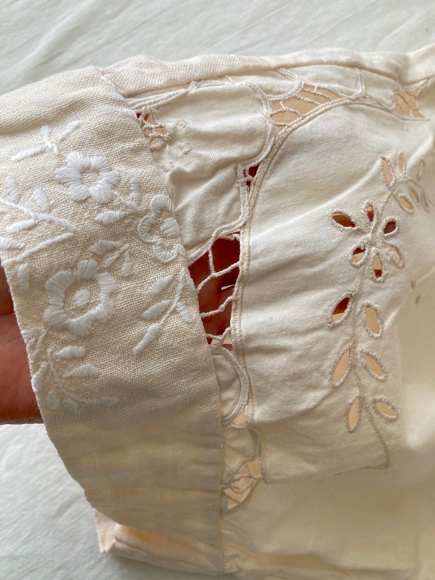 ナチュラルなリネン素材に、贅沢な手刺繍とカラフルな色合い、さらにカットワーク刺繍の生地と裾ギャザーのふんわりシルエット。