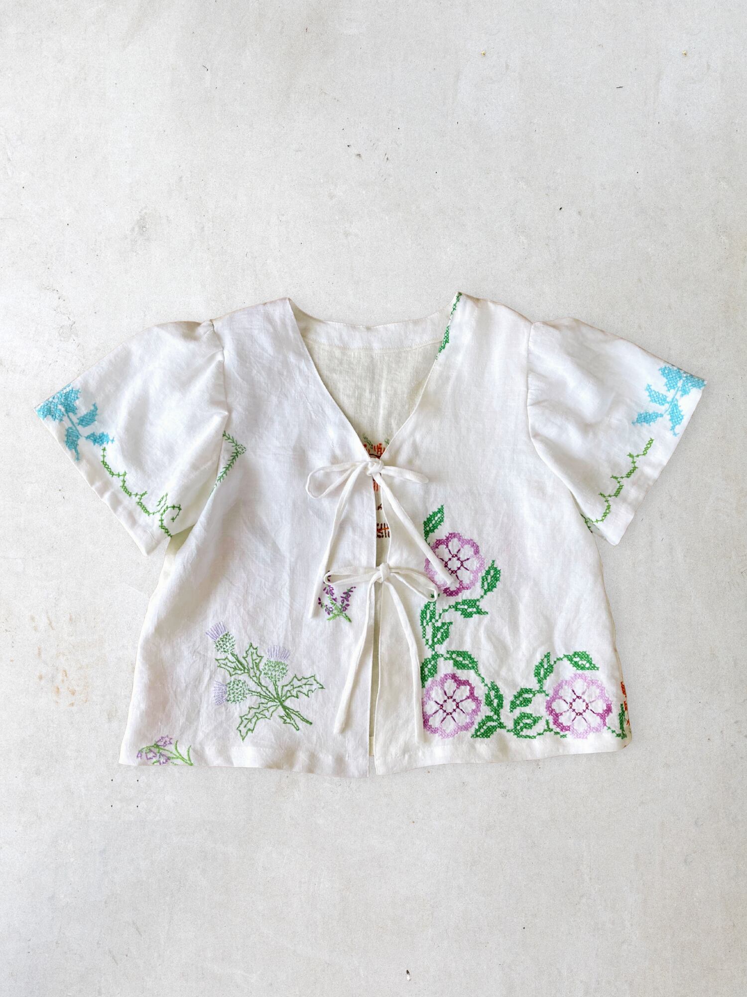ヴィンテージ リネン 刺繍 リボン 羽織り 半袖シャツ