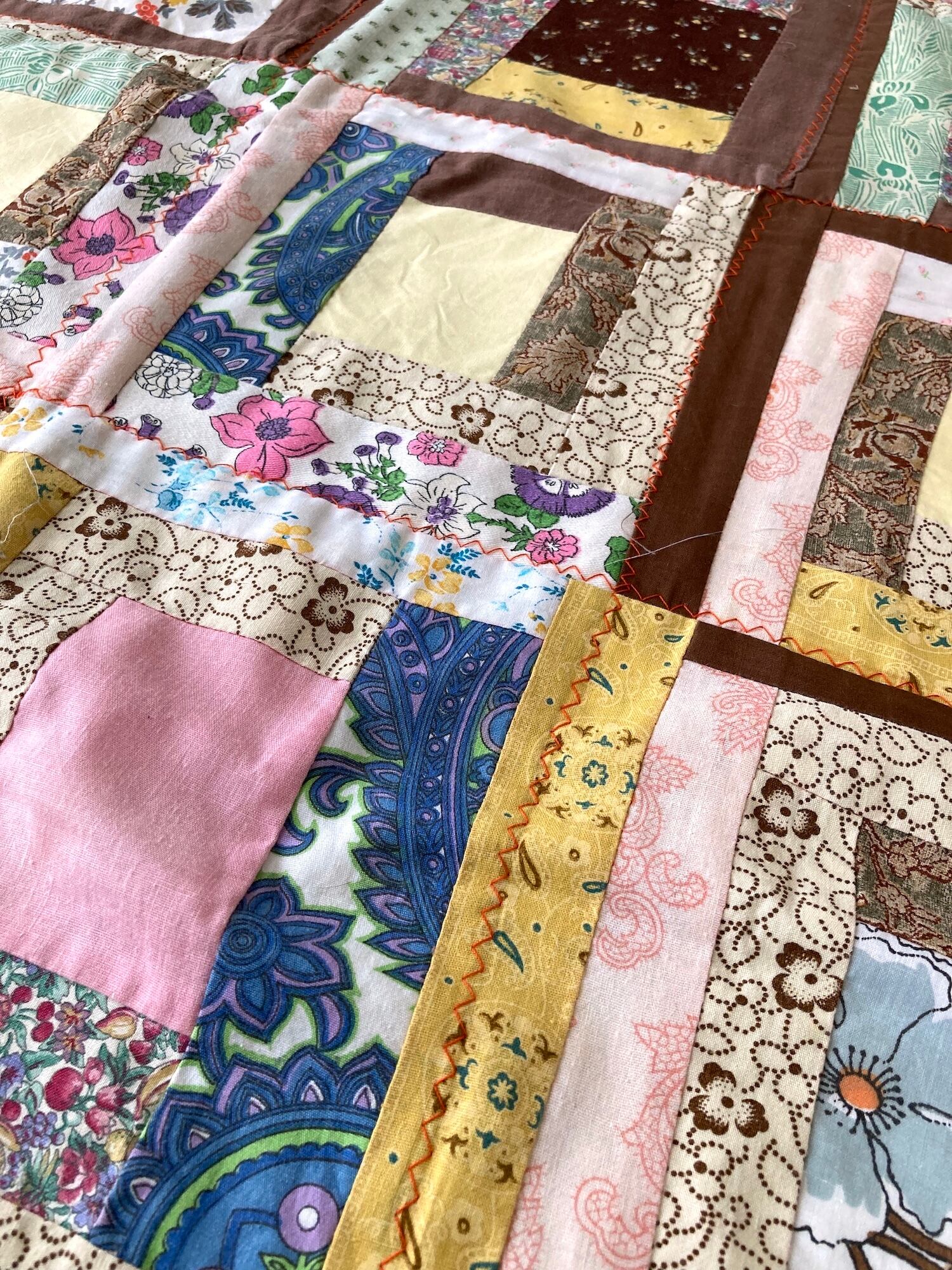 Log Cabin は正方形を中心に、その周りに布の縦横ストリップを順に回り込むように配置して模様を作る、北米発祥の代表的なパッチワーク・キルト技法です。レトロな生地にしか出せないノスタルジックな雰囲気が、お部屋のくつろぎ空間にぴったりです。