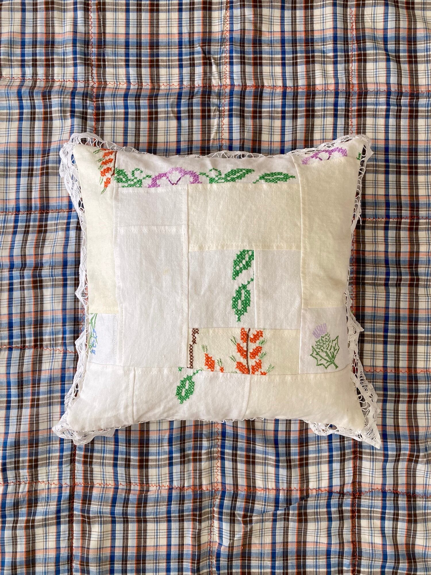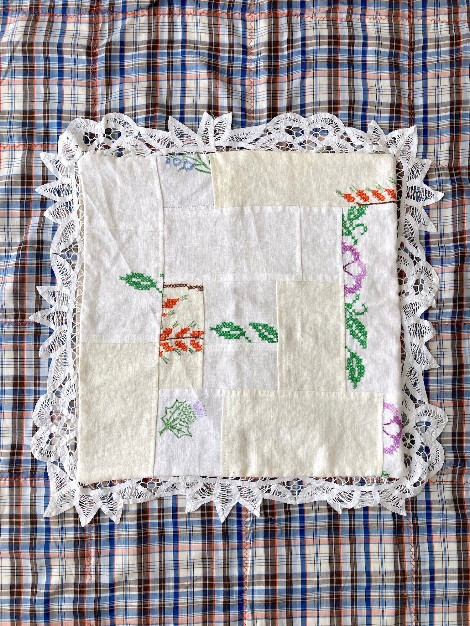 ヴィンテージ リネン刺繍 パッチワーク レース クッションカバー