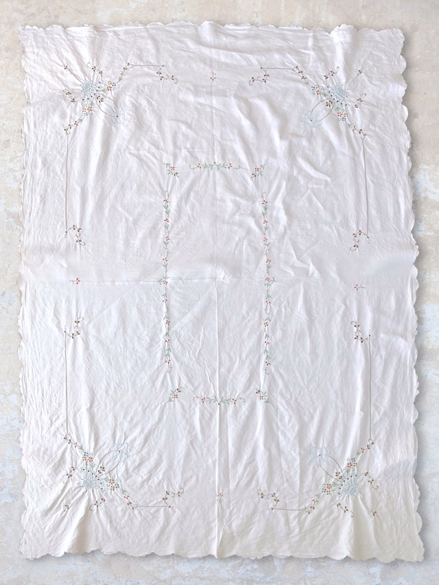 パステル系のお花のバスケット刺繍と、スカラップの縁取り、リネンの洗いざらし感のある生地が素朴で素敵な雰囲気のテーブルクロスです。