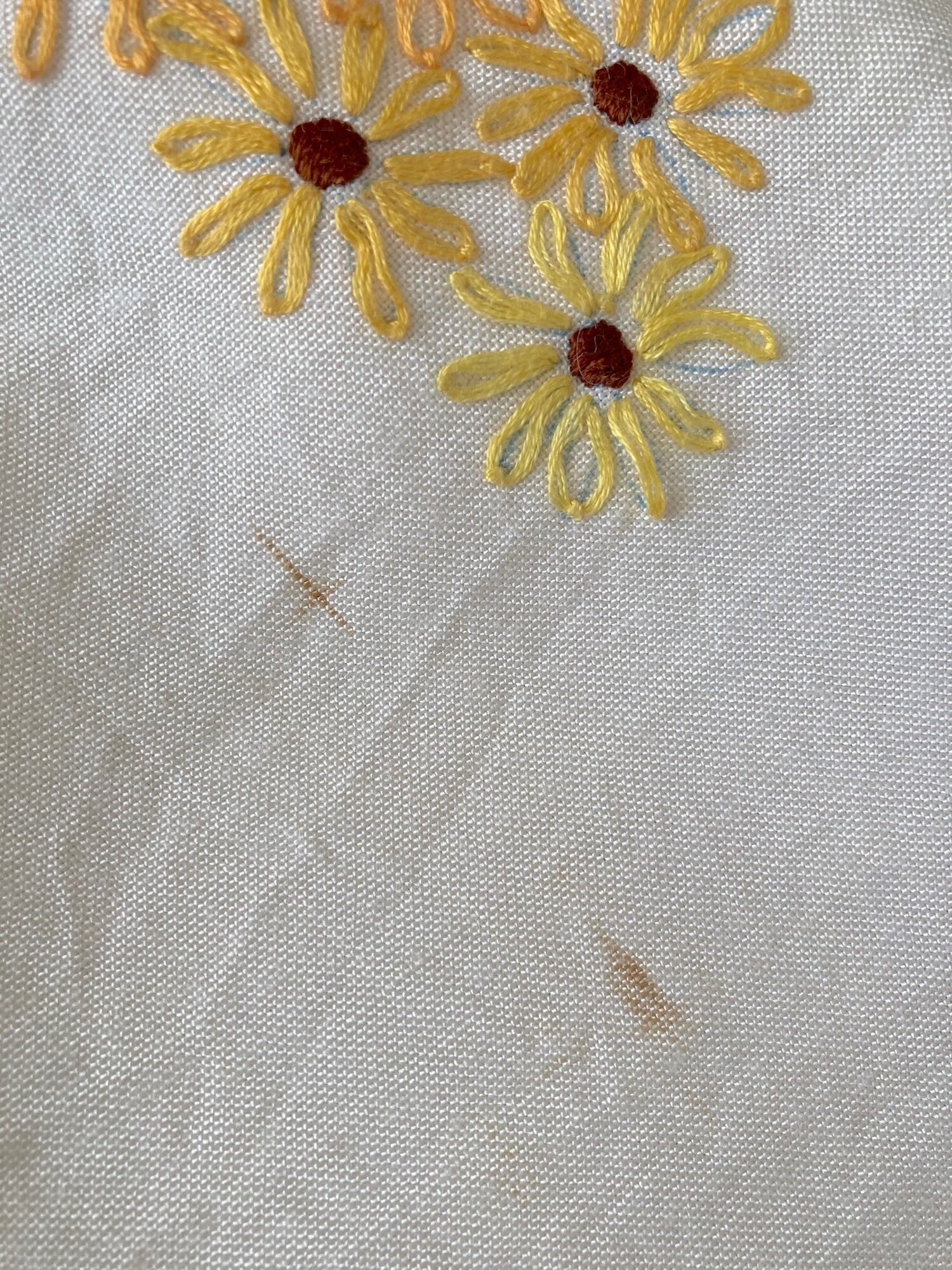フチのレースはコットン、画像で確認できるように所々にシミや汚れがあります。テーブルクロスやリメイクの材料として、いろいろな用途でお使いください。