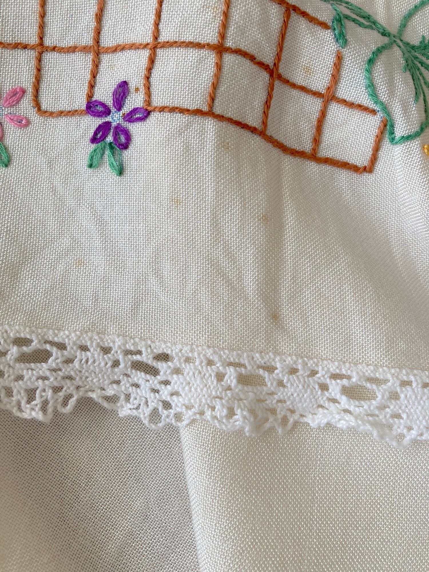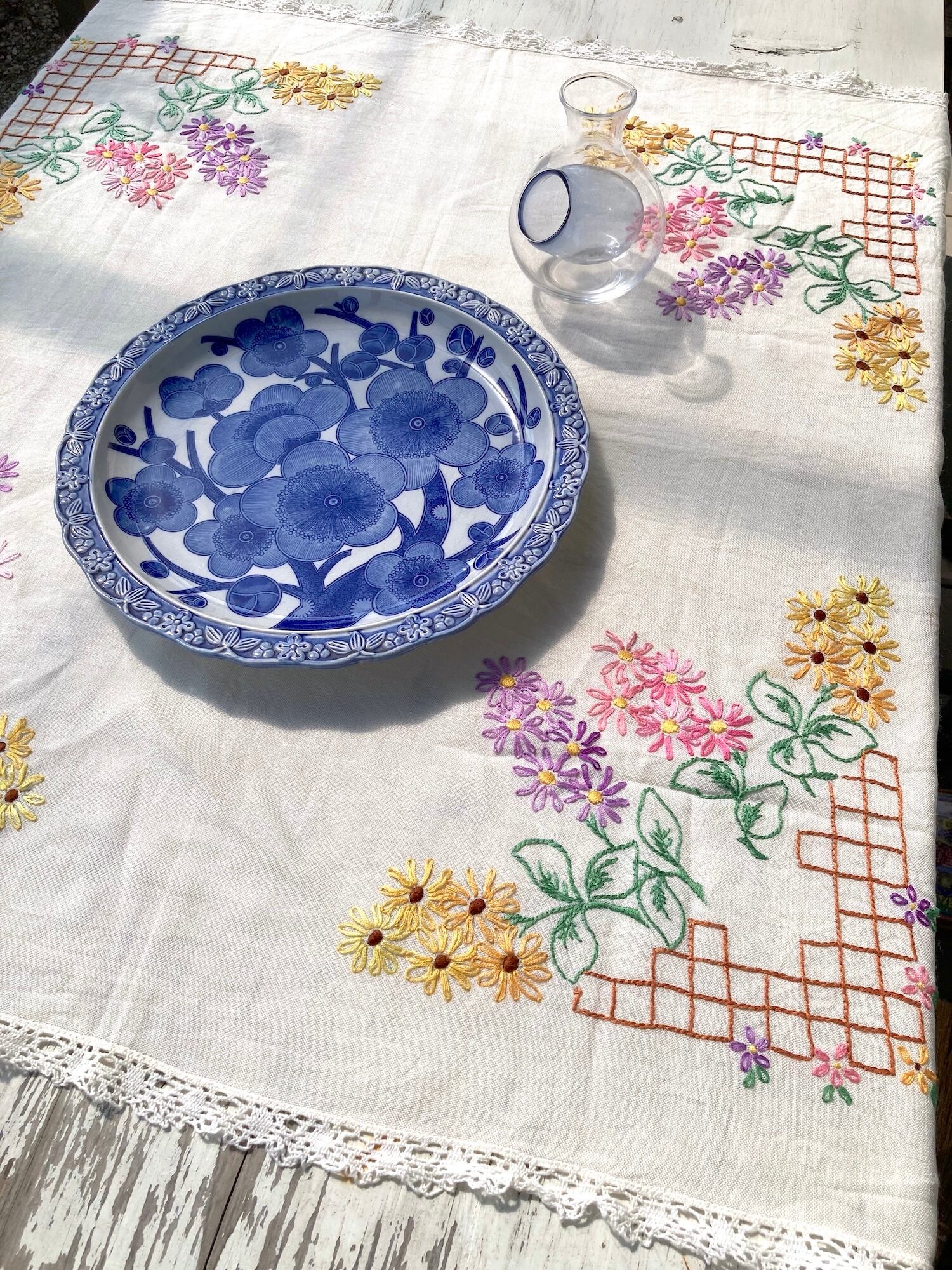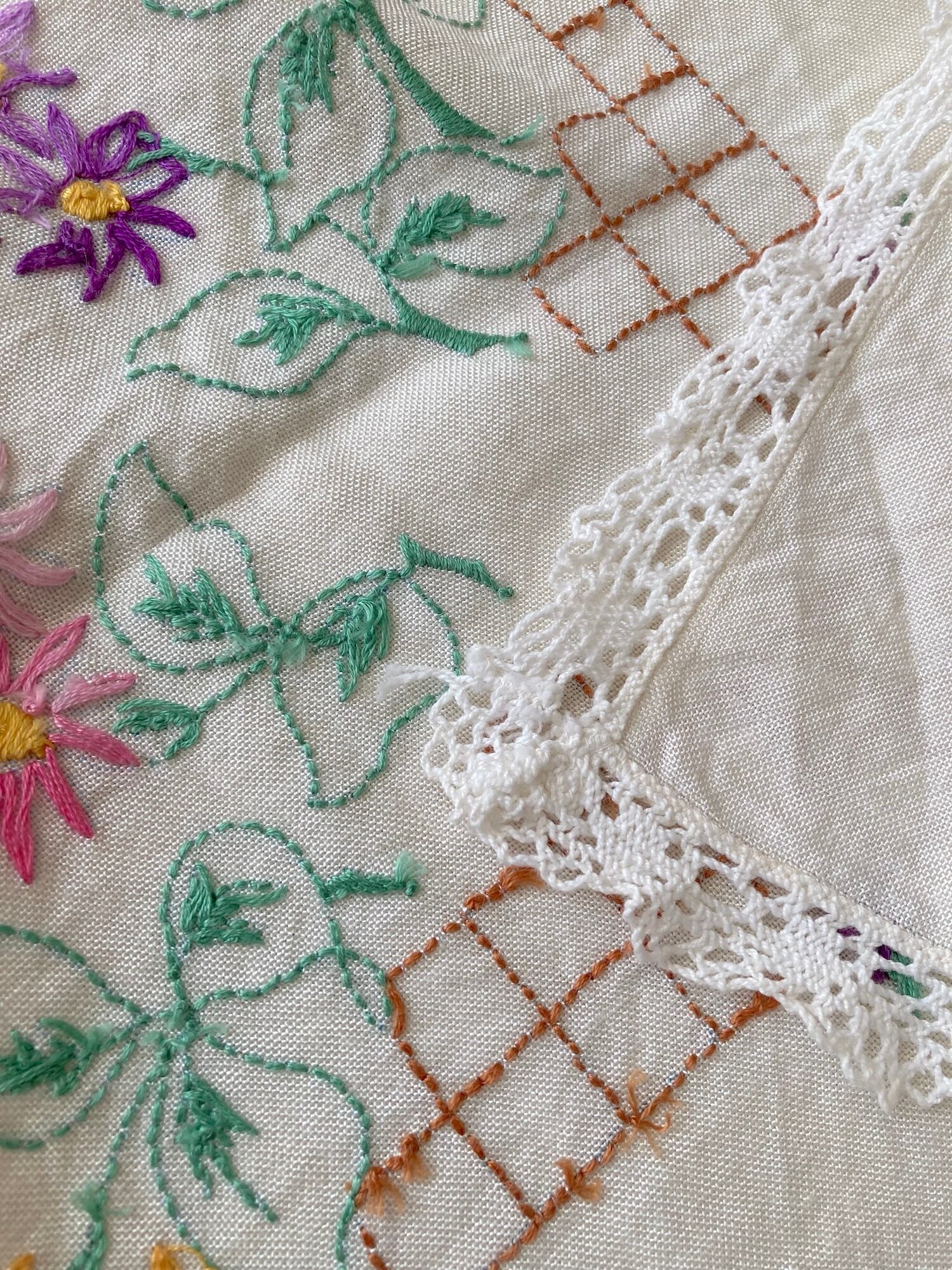 ヴィンテージ 生成り ハンドステッチ 刺繍 正方形 テーブルクロス