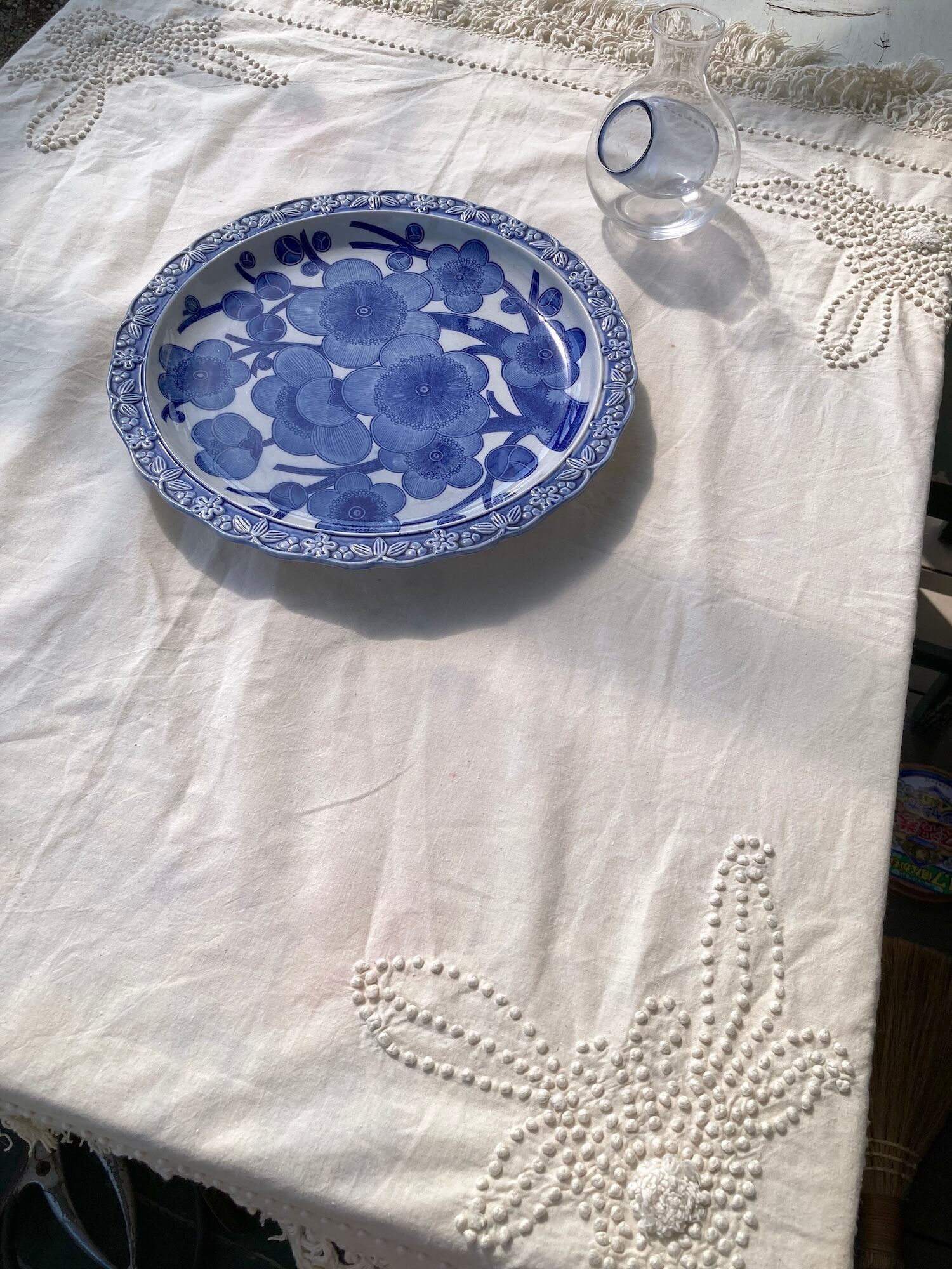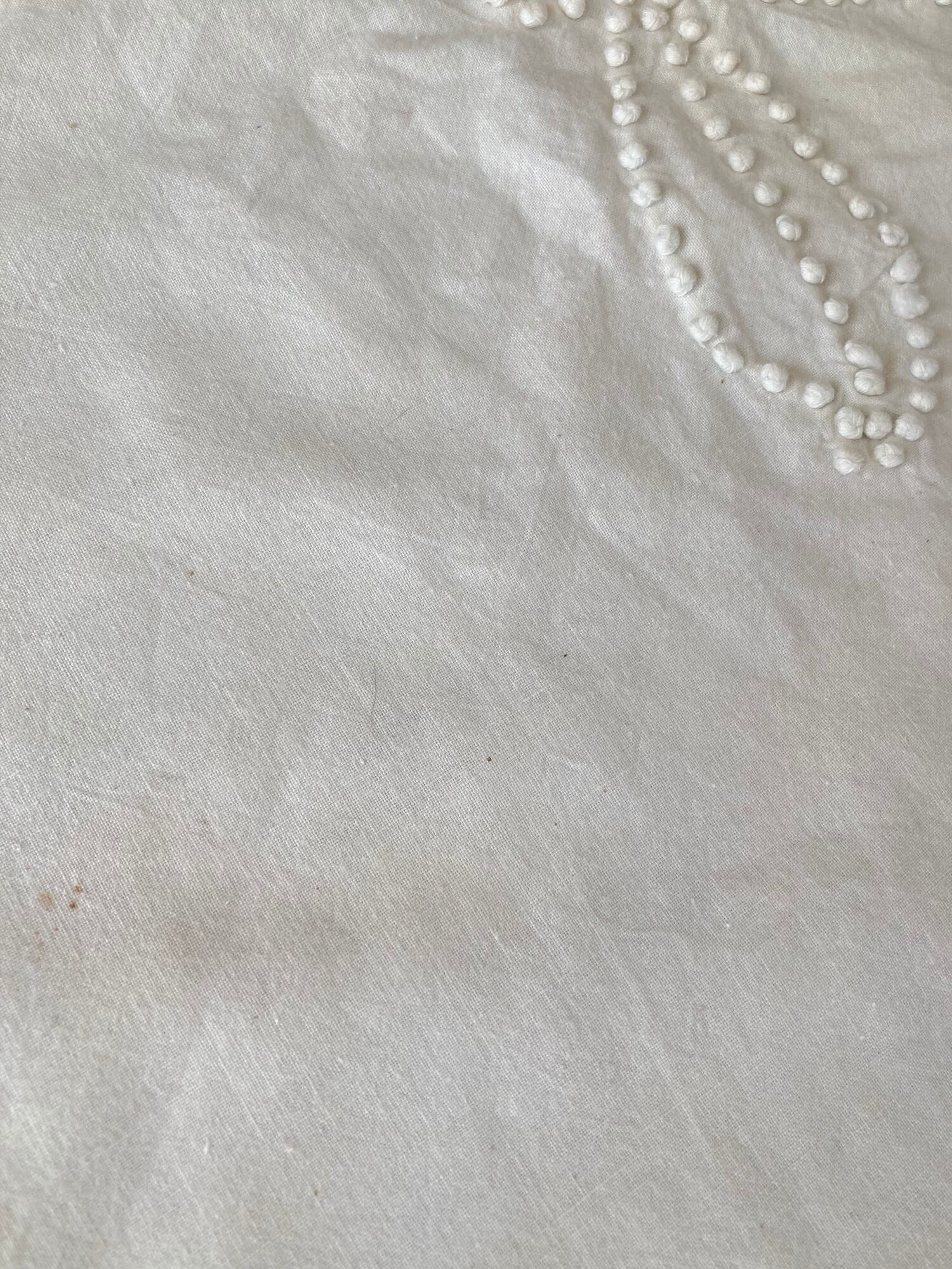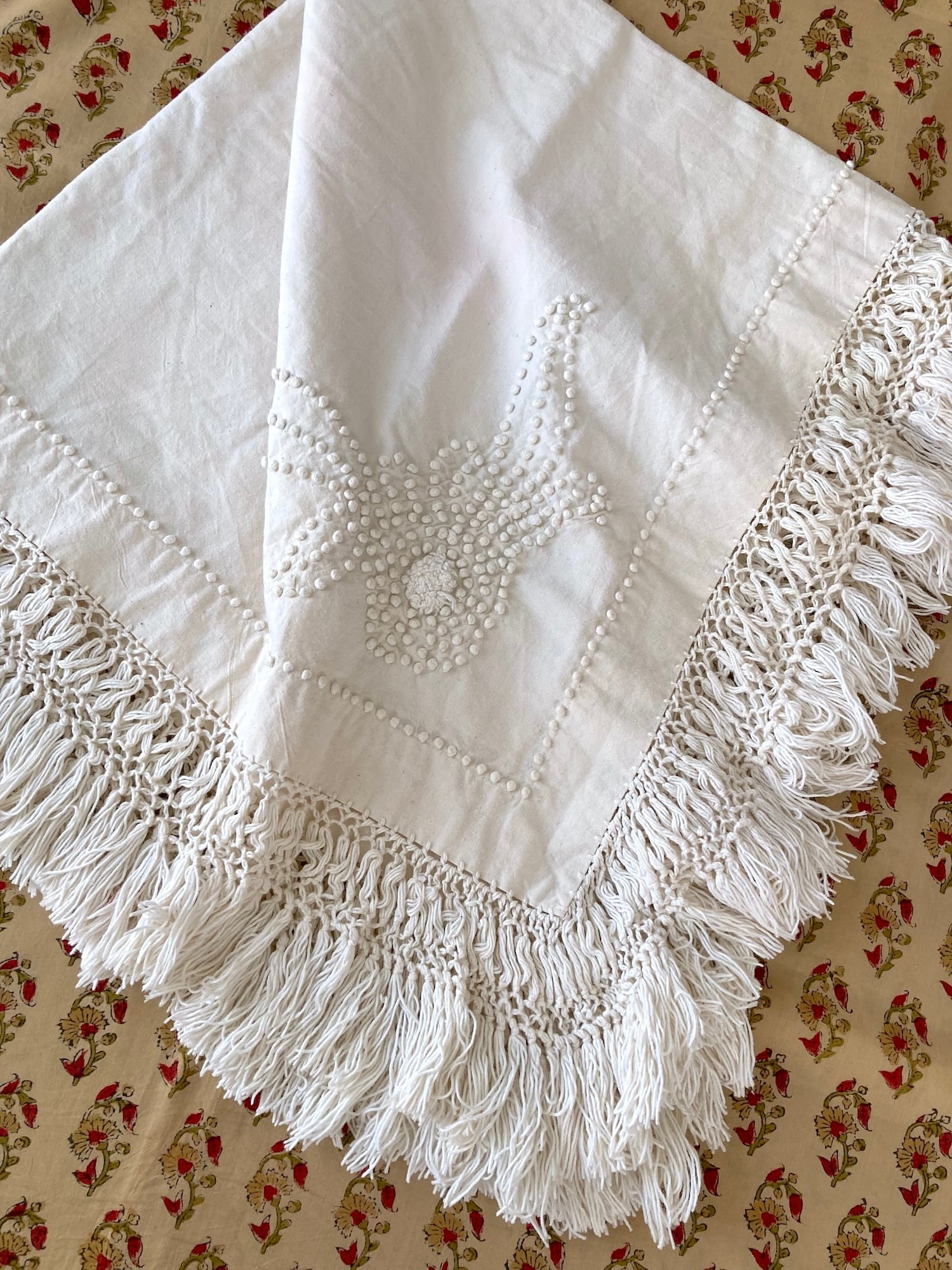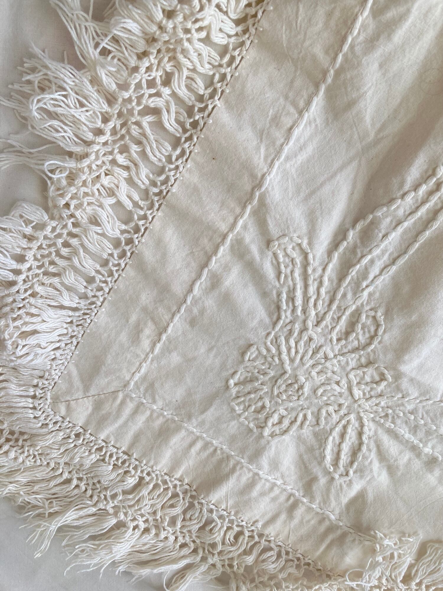 ヴィンテージ 生成り コットン フリンジ ドット 刺繍 テーブルクロス