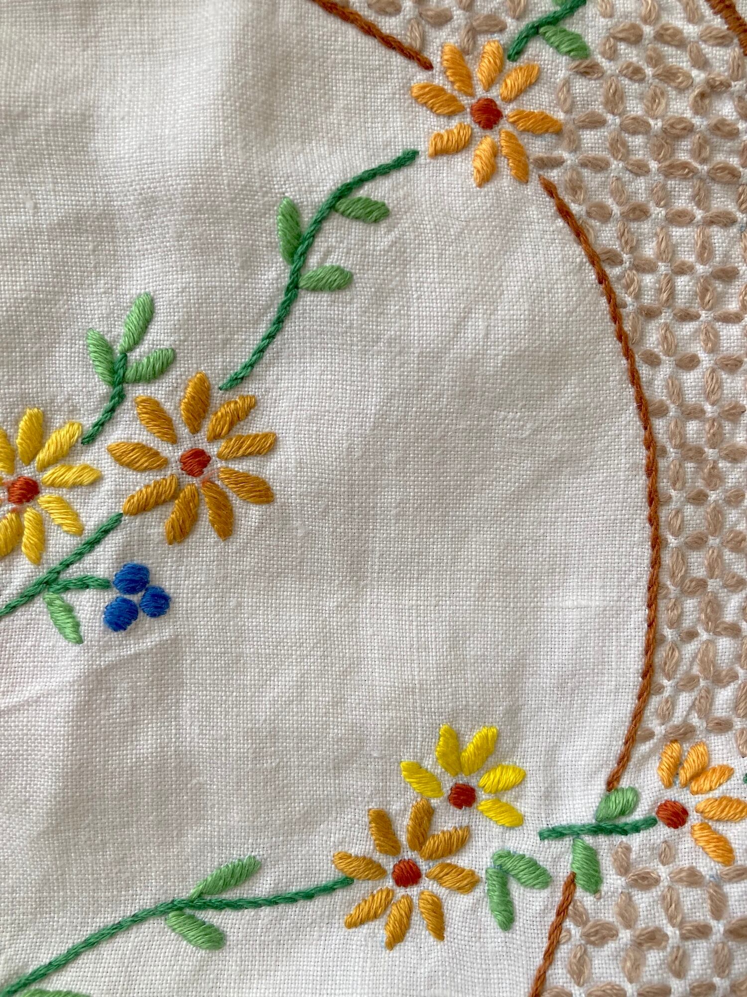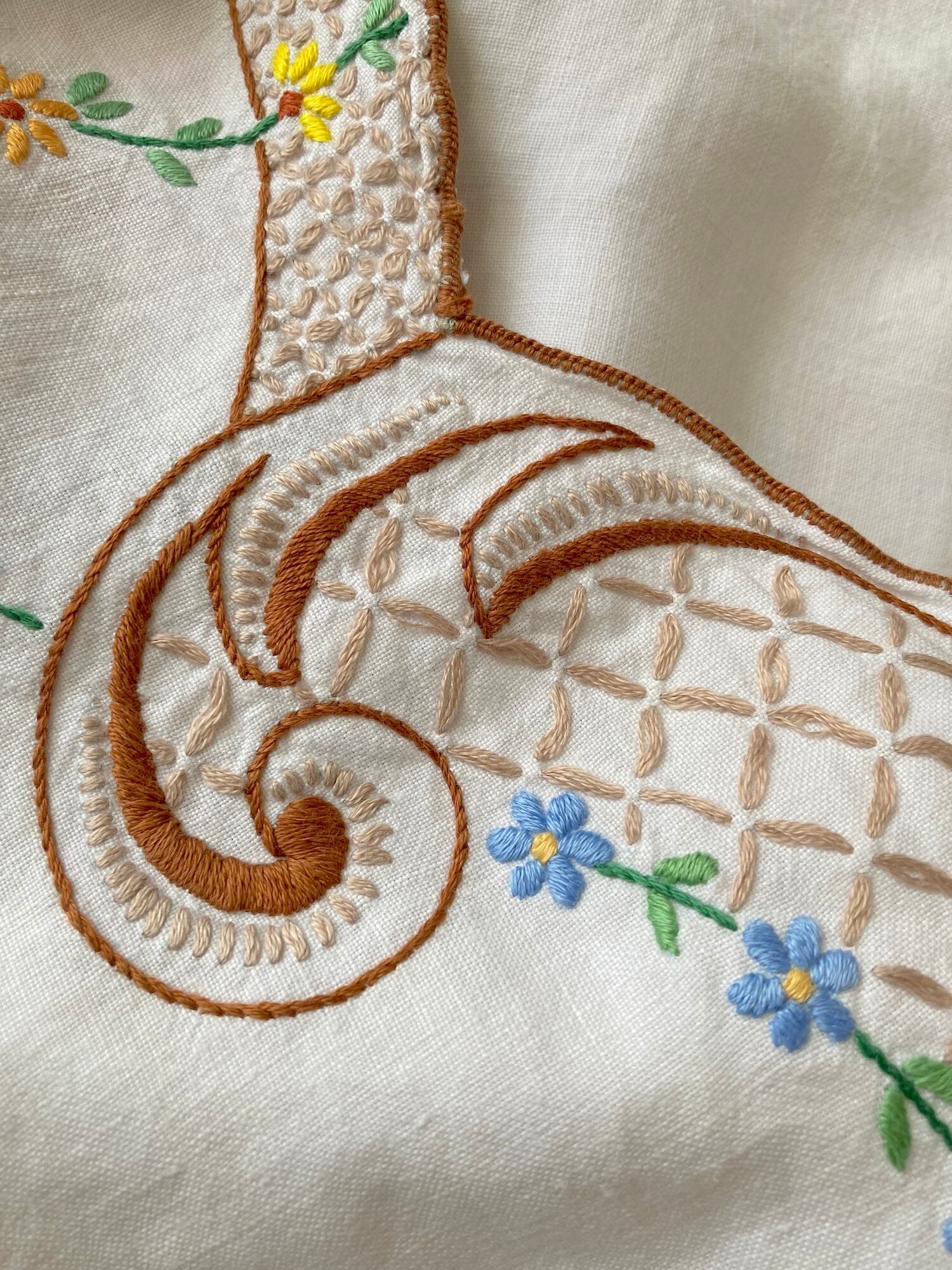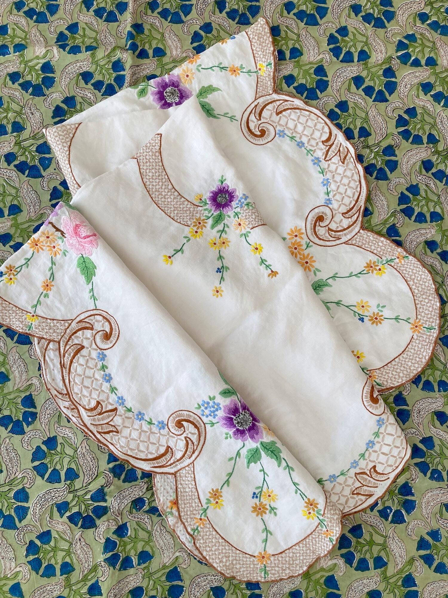 ヴィンテージ ハンドステッチ 刺繍 スカラップ テーブルクロス