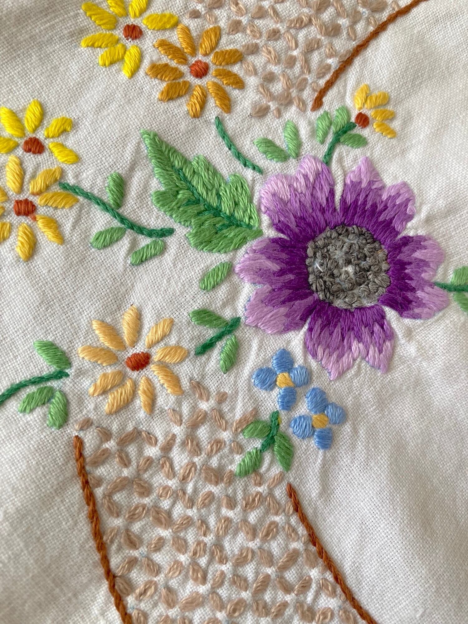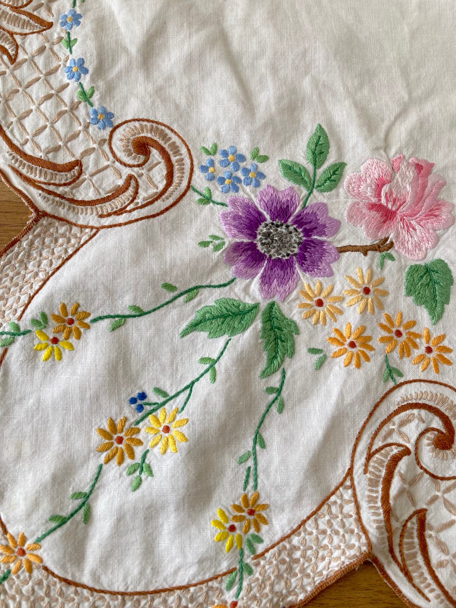 スカラップの縁取り以外、全面に施された美しい手刺繍が目を引くヴィンテージのマルチクロスです。鮮やかな色使いと丁寧な手仕事が織りなす刺繍ワークは、思わず見入ってしまうほどの魅力があります。