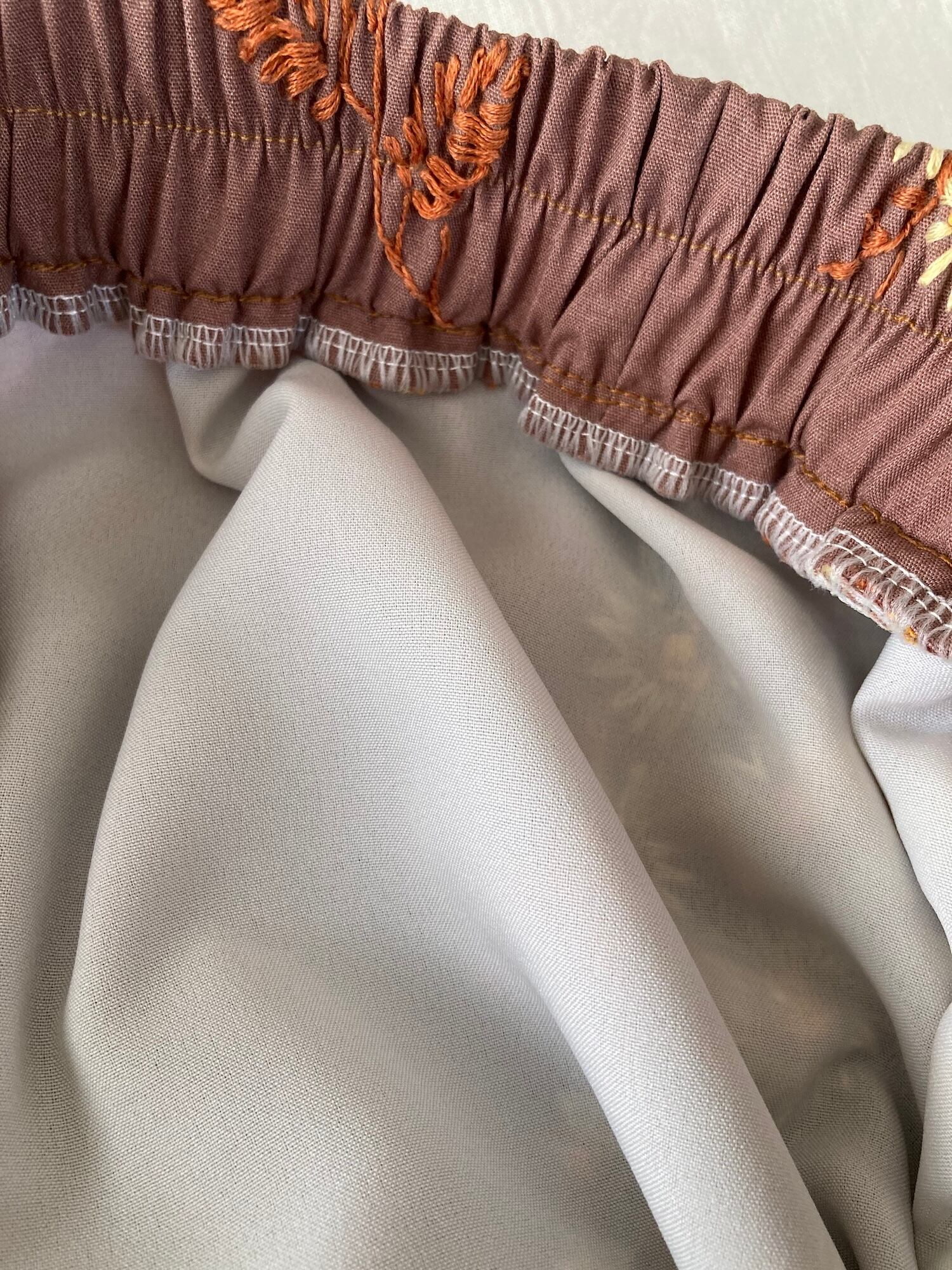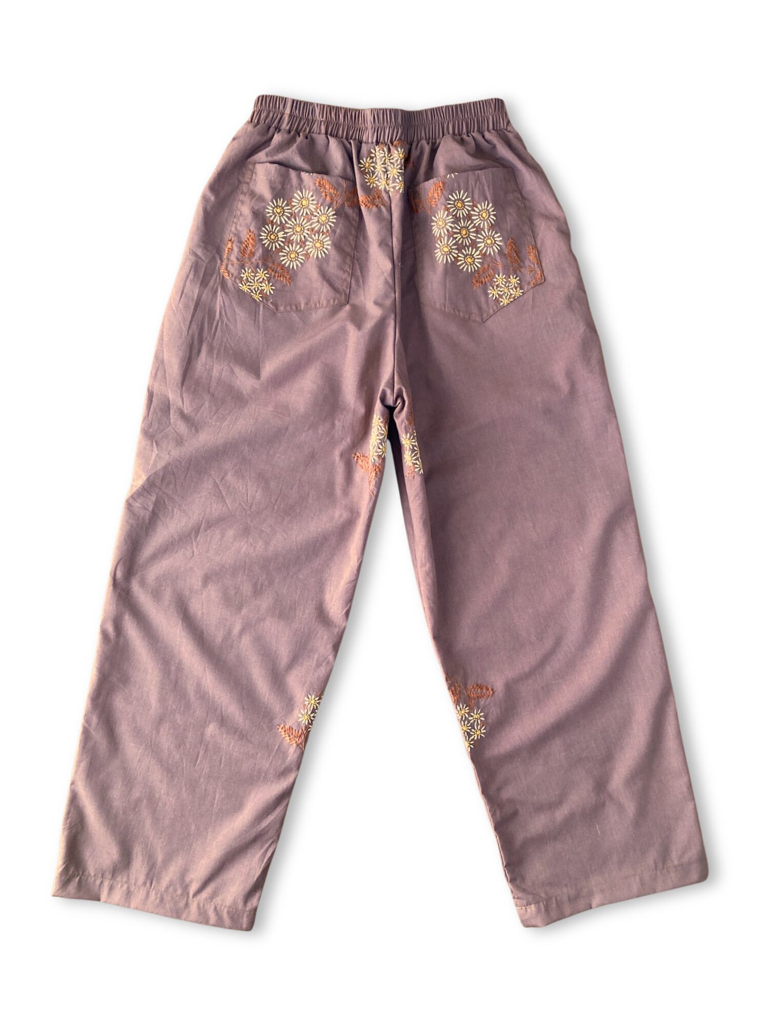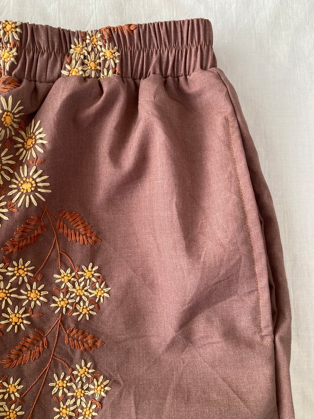 落ち着いたブラウン生地に刺繍カラーも控えめな、ニットに合わせると可愛いパンツです。一応裏地がついていますが、透け感のない生地なので一年中使えると思います。トップスを変えてコーディネートを楽しんでください。
