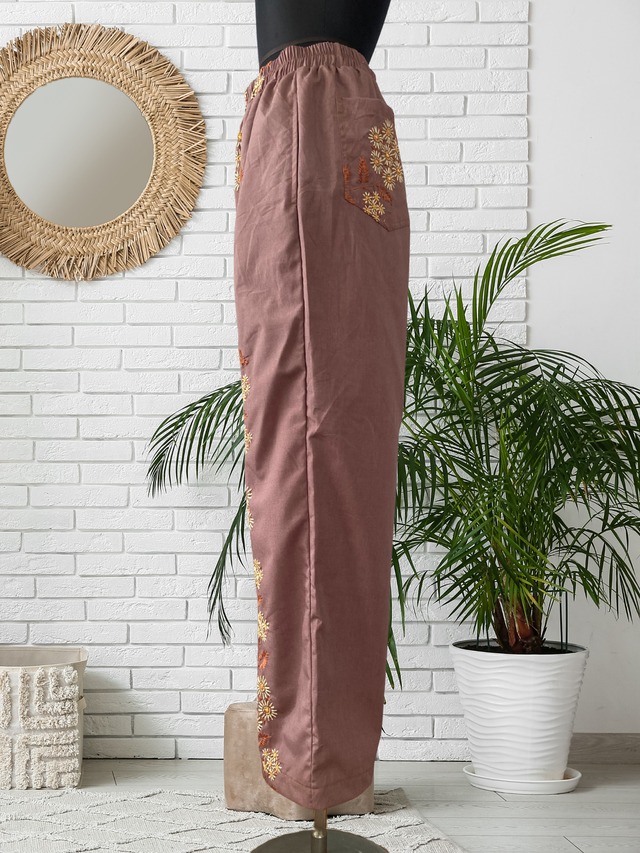 ヴィンテージ 刺繍 コットン生地 ブラウン イージーパンツ