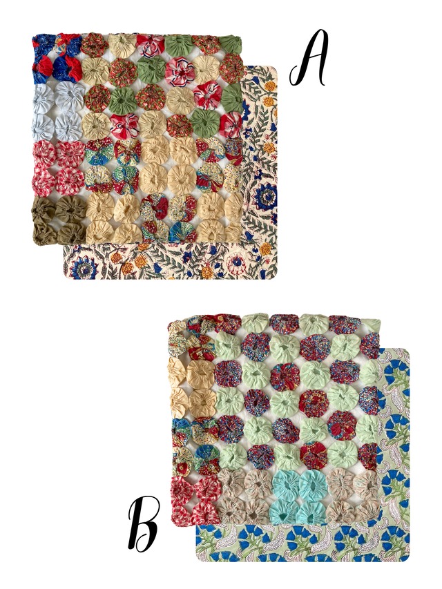 ヨーヨーキルトは20世紀初期から中期にかけてアメリカで親しまれた手仕事で、小さな布を丸く縫い寄せてつなぐ温もりあるパッチワークです。