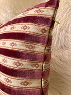 深いワインカラーのストライプが、ヨーロッパな雰囲気たっぷりのクッションカバーです。ヴィンテージ家具との相性はもちろん、ナチュラルな家具にも合わせやすそうな色合いです。色々なタイプのクッションや家具と合わせて、インテリアを楽しんでくださいね。