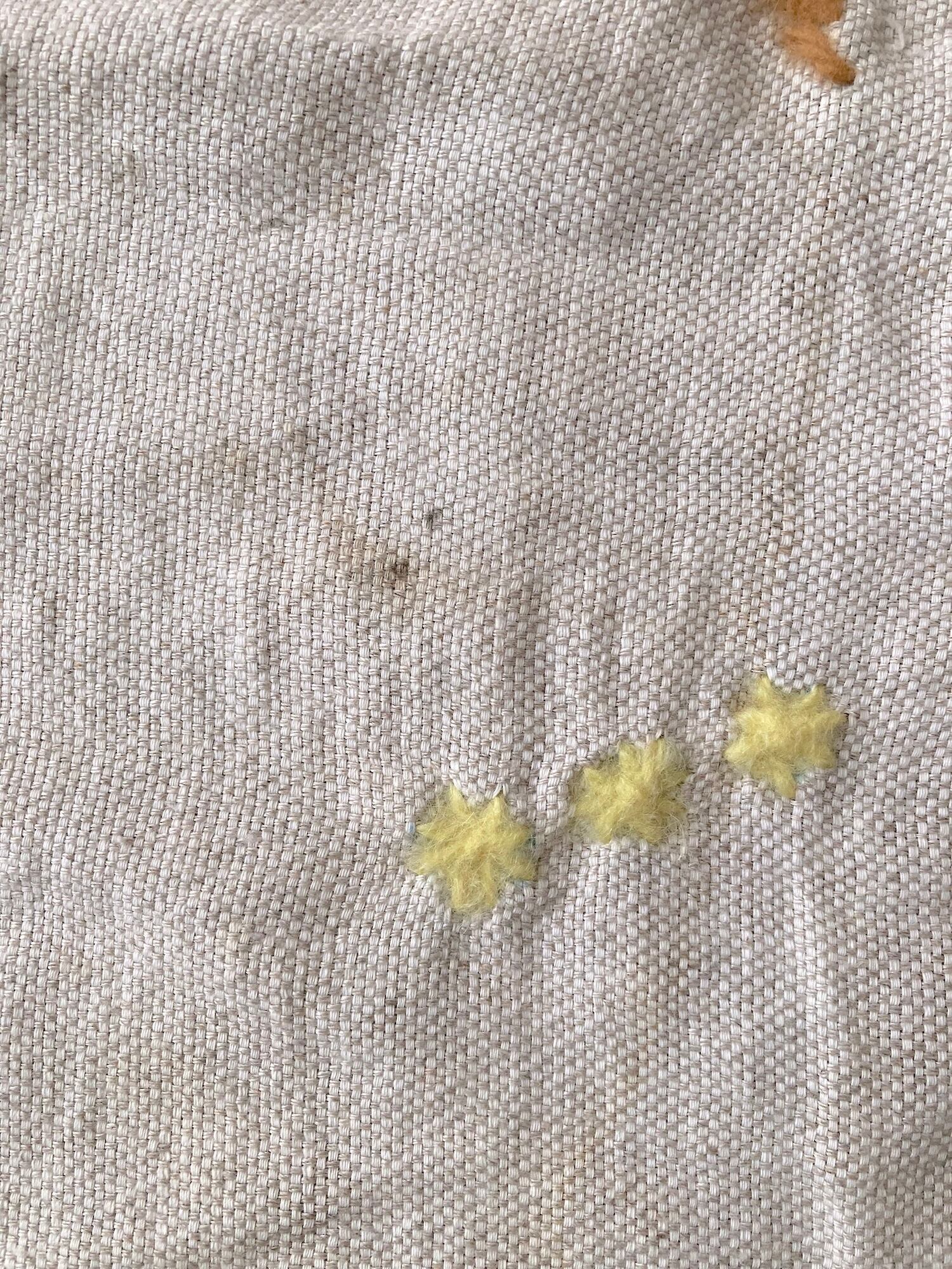 正確な素材は分かりませんが、コットンリネンのような肌触りの、太いウール刺繍が可愛いマルチクロスです。しっかり厚手の生地ですが、コットンだけじゃない柔らかさのある生地です。刺繍の凹凸により若干生地の歪みがありますので、ソファーカバーのように何かに被せたりする使い方が良いかもしれません。