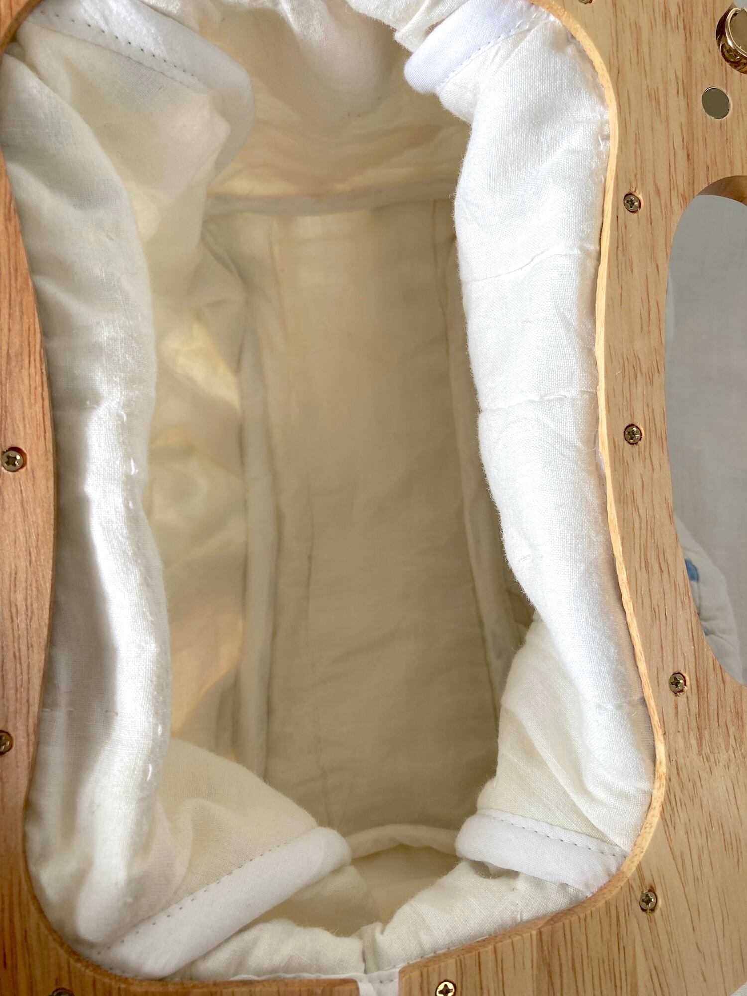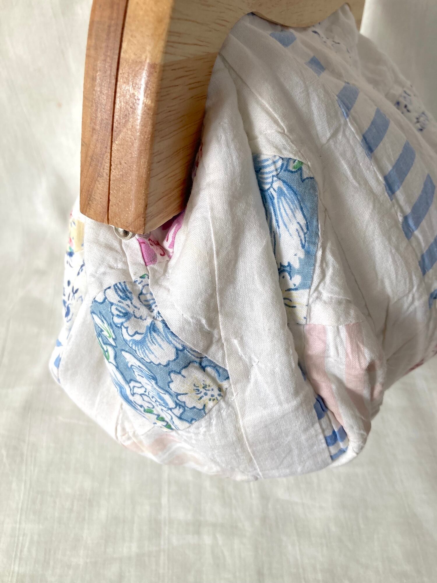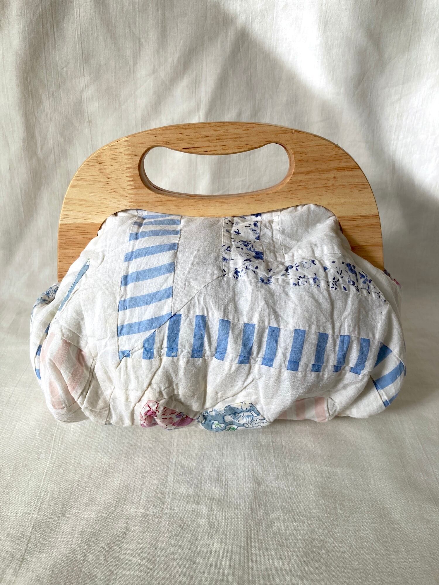 ヴィンテージキルトをリメイクした、パッチワークのがま口バッグです。ハンドルは木製で全体のアクセントに。味のあるキルトの柔らかい雰囲気と、木製ハンドルのキリッとしたコントラストが素敵な、一点もののバッグです。