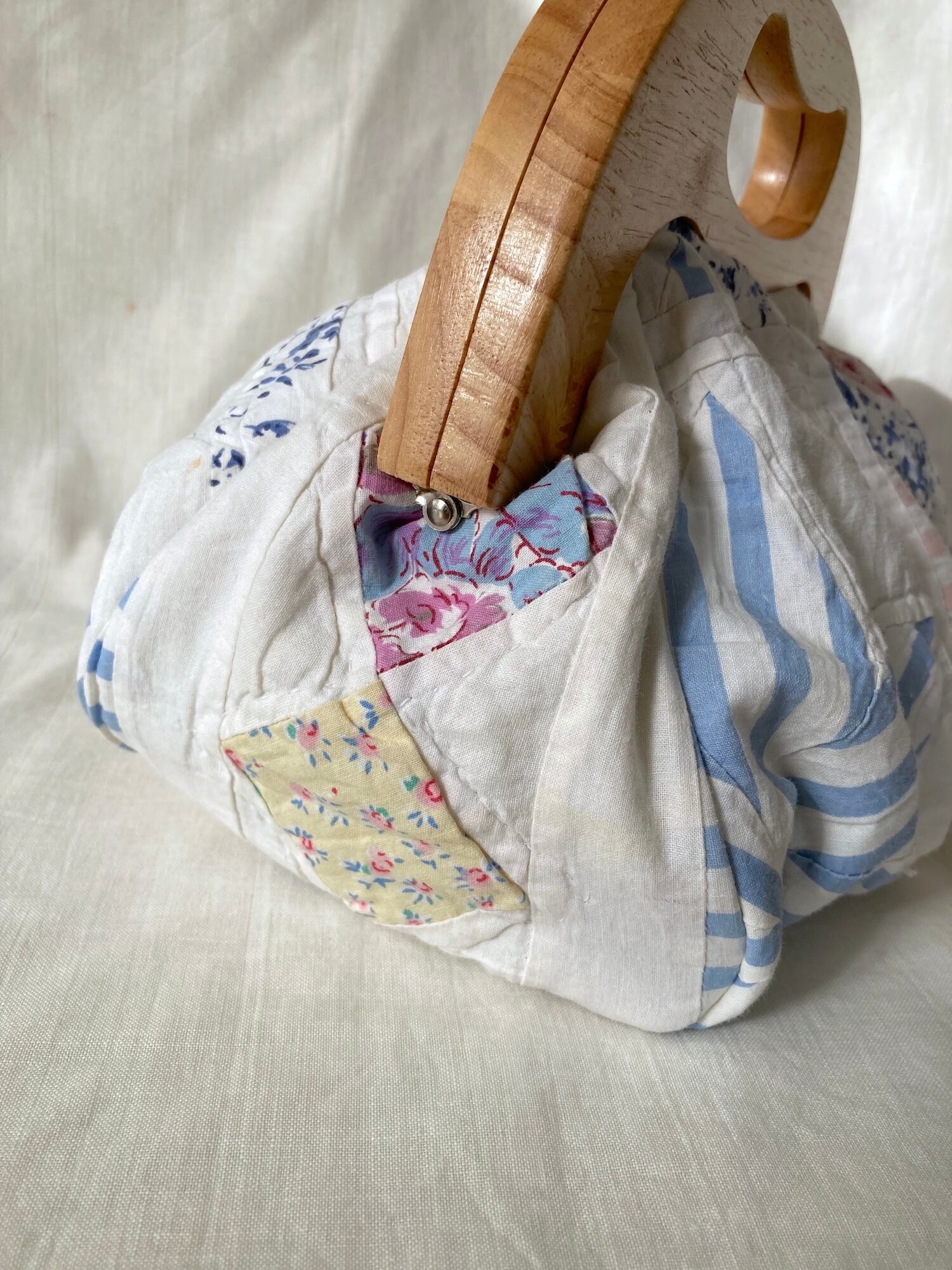 ヴィンテージ パッチワーク キルト 木製ハンドル がま口 バッグ