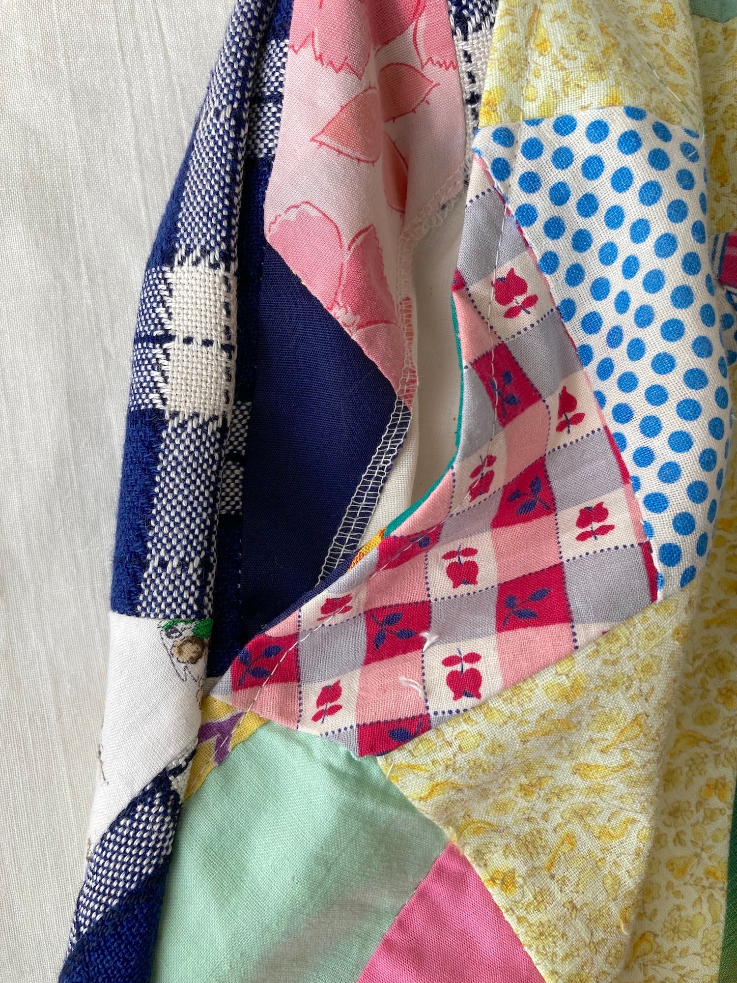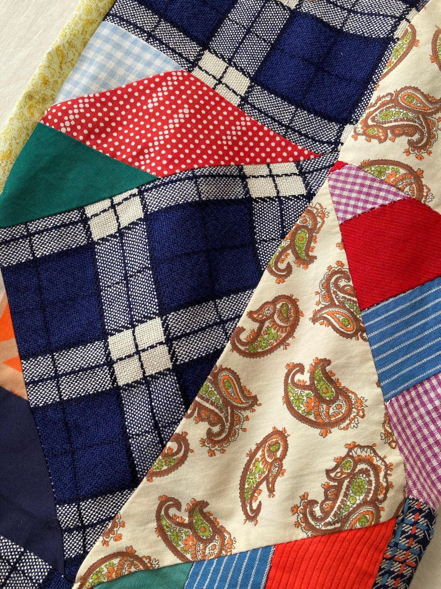 色々な素材を使ったパッチワークで、季節問わず使える生地の厚みと素材感です。裏地もついているので、パッチワークの縫い目が肌に当たらず着心地も◎