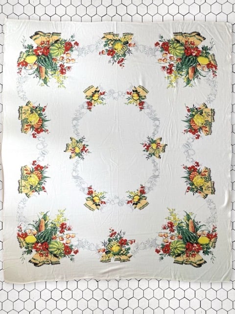白地に映えるお花やフルーツの色彩が、空間にレトロで優しい雰囲気と温もりを。豊作を祝う果物や野菜のプリントは、戦後の豊かさを象徴する50年代アメリカの定番デザインです。