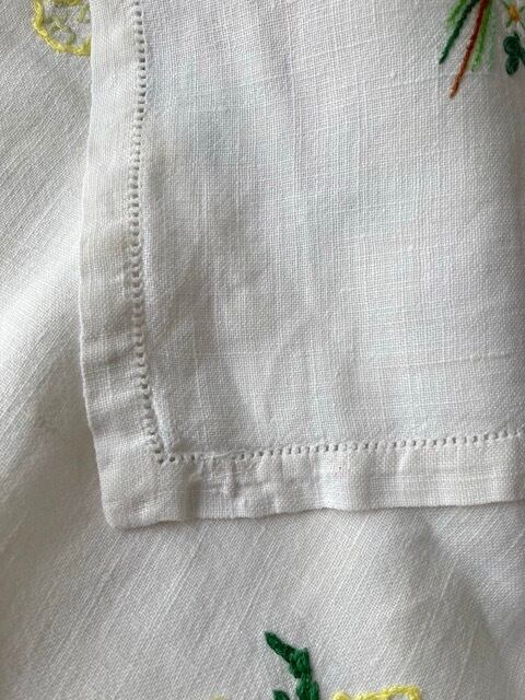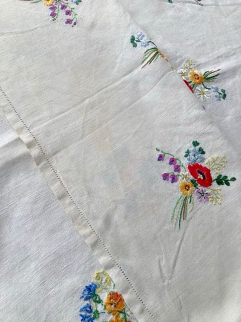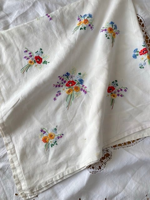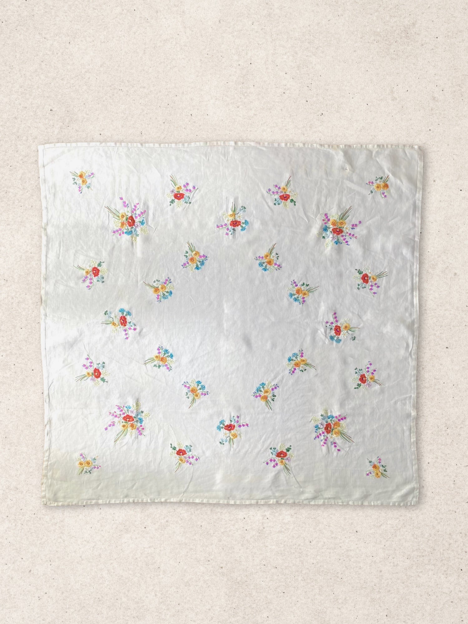 ヴィンテージ リネン お花 ブーケ 手刺繍 スクエア マルチクロス 麻