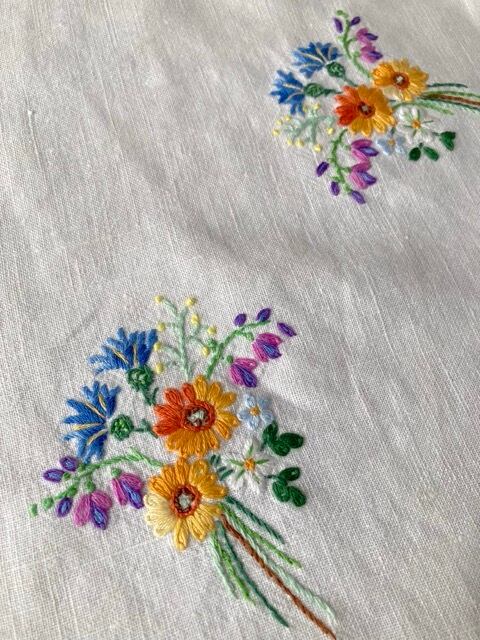 丁寧に施された野花のブーケが、上質なリネンの白に美しく映える一枚です。柔らかくなったリネン手触りと、手仕事ならではの温もりが、日常に優しく寄り添います。